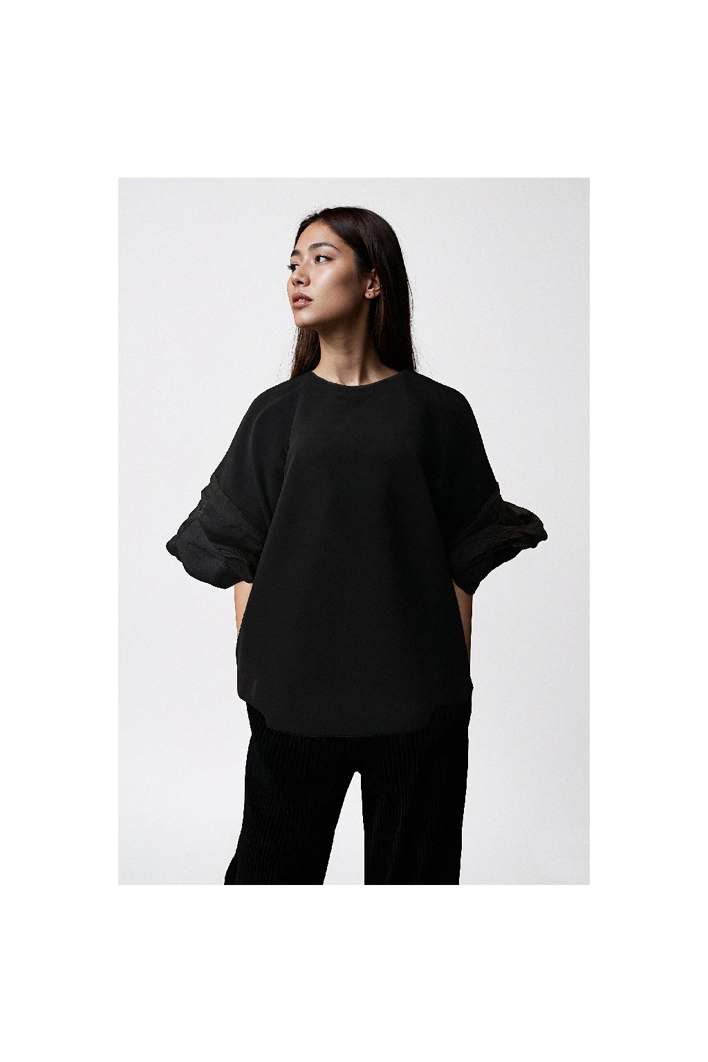 Minimalistický černý top s aurou temného luxusu. Silueta je čistá, sofistikovaná a působí jako kosmický artefakt.