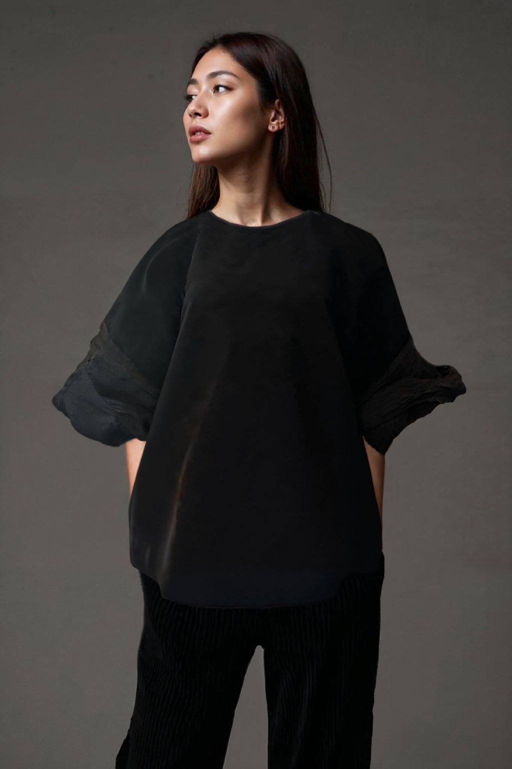 A minimalist black top with the aura of dark luxury.